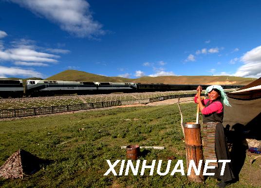 一列火车行驶在藏北牧场边(2006年7月20日)。7月8日,世界上海拔最高、冻土线路最长的铁路――青藏铁路正式通过国家验收,施工质量、环境保护等各项指标符合要求。