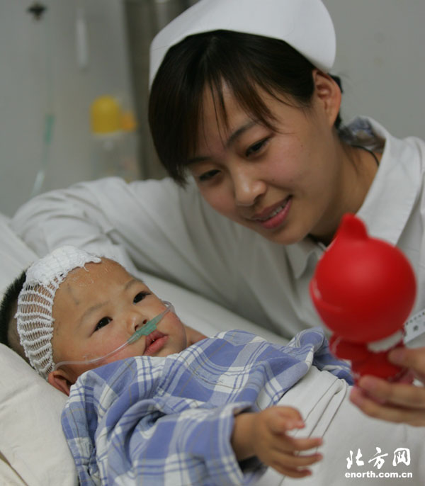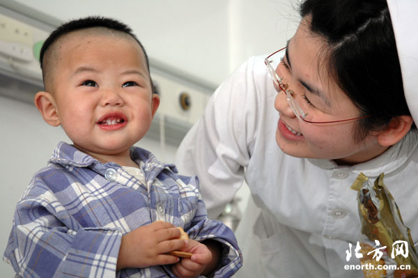 在天津市第三中心医院的“爱心病房”内住着一个可爱的女孩,她有个好听的名字叫“可心”。看着可心活泼可爱的样子,也许人们不会想到,年仅1岁的她却是一个严重的先天性心脏病患儿。日前,可心在三中心医院接受了“爱心手术”,成功获救的她不仅是今年“爱心病房”救治的第一例患者,也是本市接受此种手术年龄最小的先心病患儿。