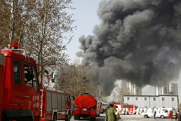 3月16日,消防人员在中央美术学院南门外临建宿舍火灾现场巡查。
