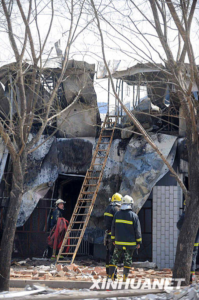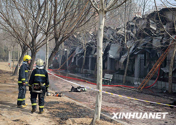 3月16日,消防人员在中央美术学院南门外临建宿舍火灾现场巡查。新华社记者罗晓光摄