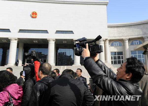 3月24日,一名电视记者在哈尔滨市中级人民法院门前拍摄。当日,哈尔滨“10·11”案在哈尔滨市中级人民法院公开审理。