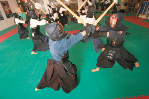 训练中的剑道选手捉对拼杀。以静制动、后发制人、以柔克刚等运动哲学深入剑道运动之中。