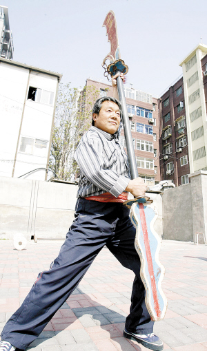 几位师傅先“热身”,接下来是两个徒弟动手。练了近两年的王楠已经能将大刀耍出个模样,不过力气、架子还是欠火候。长约2.4米的大刀呼呼带风一耍起来,路边立即出现围观群众。他一个人在前面练,一旁四五位师傅指点。