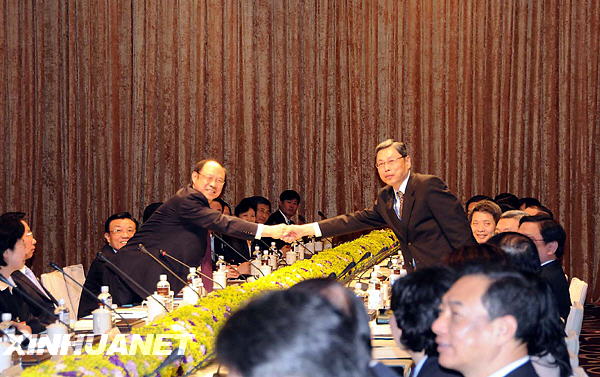 | 4月18日,海协会与海基会在台北就两会领导人第三次会谈的相关事宜进行预备性磋商。这是海协会常务副会长郑立中(左)与海基会副董事长高孔廉(右)在磋商开始前握手。 |
