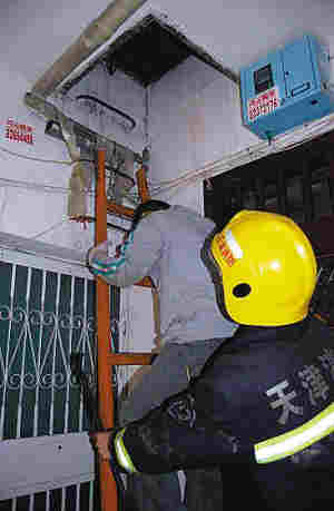 名外地来津的农民工受雇封堵住宅顶楼的天井时,竟一时大意把自己困在楼顶上。最后,消防队员将被困的二人从楼顶救下。