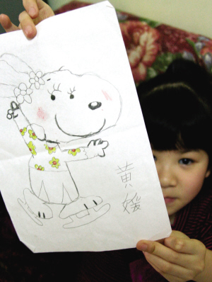 梳着高高的马尾辫,小脸蛋总是粉扑扑的。一直礼貌地对周围人微笑问好!活像个美丽的瓷娃娃!这是对黄媛的印象。心想:如果她没得病,这样无忧无虑的年龄也会像其他孩子一样活泼好动,蹦蹦跳跳快乐生活。黄媛拿出了她平时画的很多画和一些小制作,画上是一只飞舞溜冰的小兔子,这是爱画画的黄媛最得意的作品,也是她的梦想!