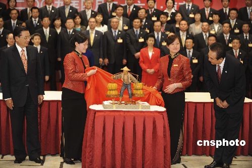 4月26日下午,江丙坤向陈云林赠送礼品皮雕。皮雕是一位台湾农民挑着满框南瓜的人物造型。中新社发