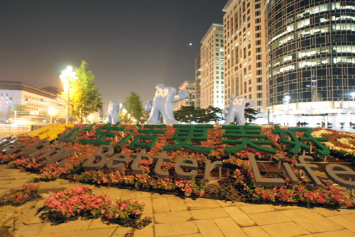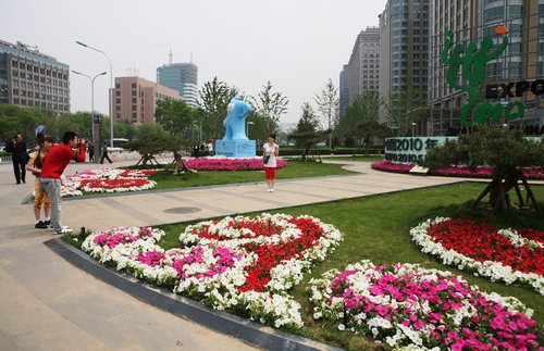 在世博会开幕倒计时一周年前夕,中国2010年上海世博会花坛亮相北京。同时,活泼可爱的“海宝”也在长安大街“频频”向路人微笑招手致意,深受民众喜爱。