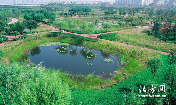 (3)湿地-湖泊带:包括带状湖泊和两侧的湿地。外围为临湖亲水带,由顺地势跌落的栈桥构成,丰富的水际植物掩映着穿越其中的栈桥,使人与水和生物近距离接触;在内侧(湖的西、北侧)为大片的湿地,恢复和再现天津地域性景观,由芦苇和其他湿地植物构成。一条蜿蜒的步道栈桥穿越其中,并穿连多个木平台和荫棚。两个滨水湿地都是湿地植物的科普走廊,取样天津湿地植物。