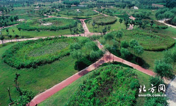 (1)城市林带:临街一侧为林荫带,密植适宜于本地生长的白腊树林,形成城市林带,划出一条鲜明的城市边缘线,并将城市步行道置于林中,提升城市意象、改善城市体验,并使公园有一个鲜明的缓冲带,将道城市路上的噪音隔离和吸收,营造一个城市中的桃花源。