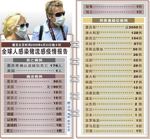 截至北京时间30日晚8时,有关各国公布的猪流感疫情最新数字如下: