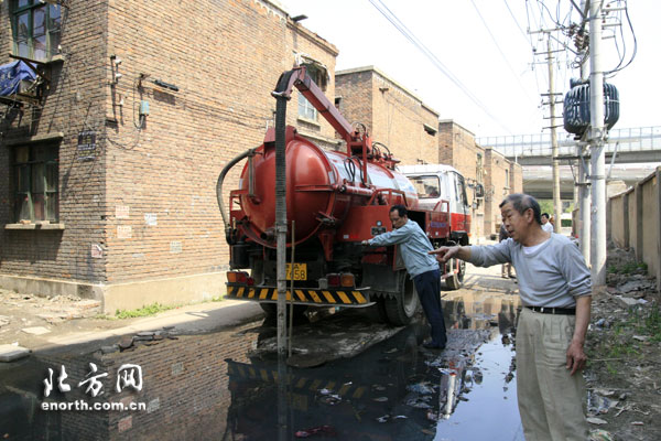 | 外溢的污水给居民生活带来不便,董大爷(右)非常感谢河西排水所的师傅为民服务 |