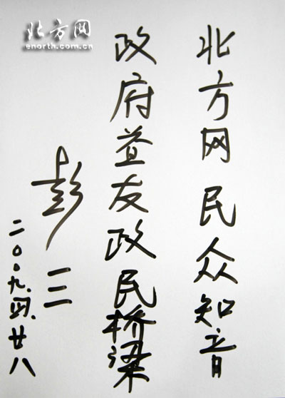 | 区长彭三称赞北方网为区政府和网民间的沟通搭建了一座桥梁,图为彭三的寄语 |