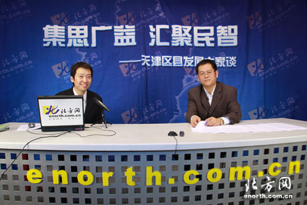 | 4月28日,河西区区长彭三(右)做客本网,倾听网民心声,与网民畅谈河西发展 |