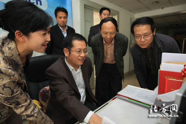 | 图为彭三区长浏览北方网网友提出的问题 |