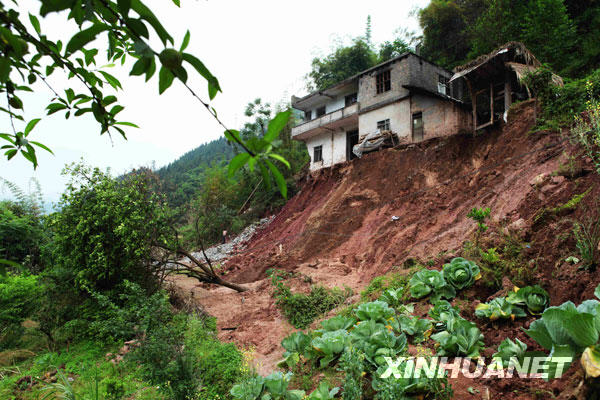 巴东县姚家滩滑坡体整体滑移造成附近民房倒塌(5月10日摄)。