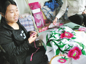白色的底布上,大朵鲜艳的牡丹花,呼之欲出的蝴蝶,福兰的羌绣作品非常精美,有一幅最满意的,福兰还攒钱买了一个相框裱了起来。“我读书少,没有其他本事,但我会绣花,我相信自己能养活自己!”说起对未来的打算,自幼随母亲学习了一手好绣工的福兰这么说。