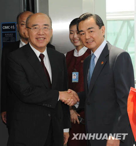 | 5月25日,中共中央台办主任王毅(前右)在北京首都机场迎接中国国民党主席吴伯雄。 |