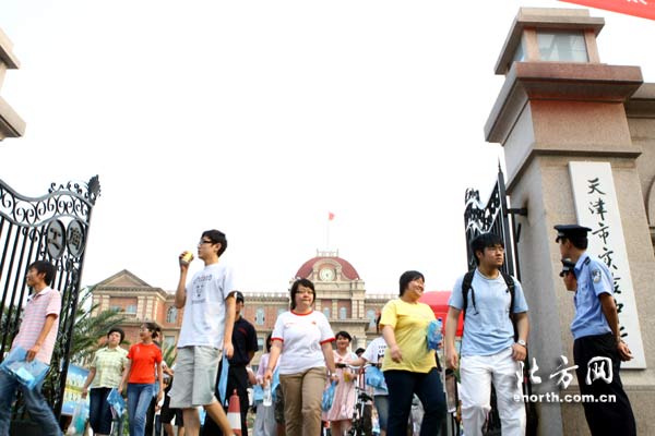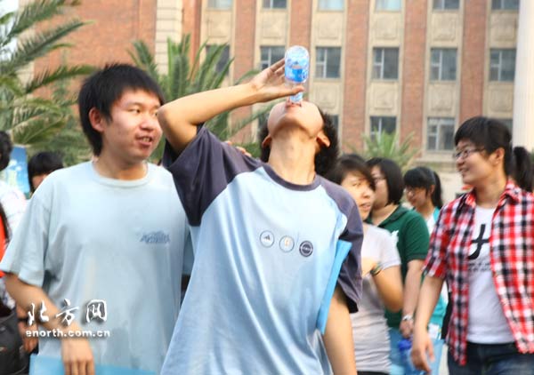 一位考生走出考场后,将手中矿泉水一饮而尽