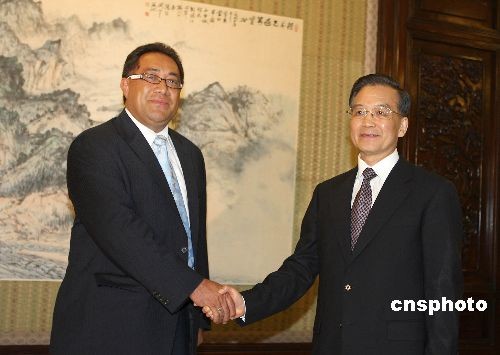 6月16日下午,中国国务院总理温家宝在北京中南海紫光阁会见太平洋岛国议会代表团。该代表团应中国全国人大常委会委员长吴邦国的邀请访华,成员包括密克罗尼西亚联邦国会、汤加王国议会、斐济群岛共和国公共账目委员会、纽埃议会和瓦努阿图共和国议会。图为温家宝与汤加王国议会议长图伊拉克帕握手。