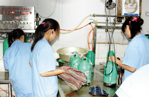 昨日上午,记者跟随河北区质量技术监督局来到位于河北区增产道附近的某工厂大院内,在靠近角落一侧的空地上堆放着许多废旧的绿色企鹅壶,旁边的一间平房就是“企鹅啤酒”的加工场所,门口没有悬挂任何招牌。只有七八十平方米的三间屋内堆满了刚刚灌装好并已封装的“企鹅啤酒”,四名身穿蓝色工作服的工人挤在一间十余平方米的“生产车间”内,还在不停地灌装啤酒,其中一名女子负责从生产线上取下灌满啤酒的企鹅壶,两名女子对其进行封装,另外一名男子再把这些产品运到外面的塑料箱中。屋内的墙壁污浊不堪,水槽里漂满了尚未清洗的壶盖和壶身,空气中始终弥漫着一股刺鼻的酸味。执法人员当场责令停止生产,并查出“企鹅啤酒”200多箱,共计数千壶。