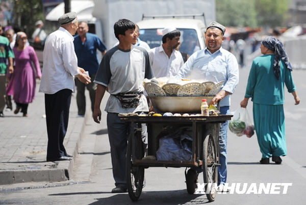 7月9日,在乌鲁木齐市二道桥地区街头,商贩在推车叫卖小吃。