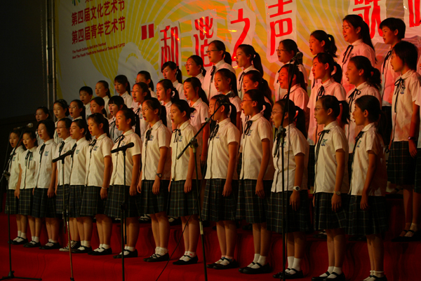 泰达一中学生合唱团在青年艺术节上演唱爱国歌曲