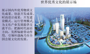 天津滨海文化产业示范区项目位于津南区。起步区规划面积13.7平方公里,拓展区规划面积16.3平方公里。它将建设成为世界优秀文化的展示场、国际文化产品的集散地和文化产品的研发生产基地。到2012年,将初步形成国家级文化产业示范区。目前,坐落在天津滨海文化产业示范区拓展区的海河故道公园,先期建成开放。公园通过恢复和丰富海河故道的湿地生态环境,结合当地的历史文化与地域特色,充分发挥其生态功能、休闲功能、游憩功能。