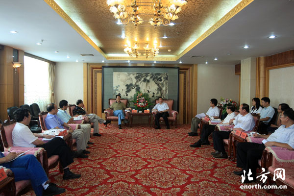 7月18日,人民日报海外版参观考察团访津。市委常委、市委宣传部部长肖怀远会见了人民日报编委委员、海外版总编辑詹国枢率领的参观考察团一行。