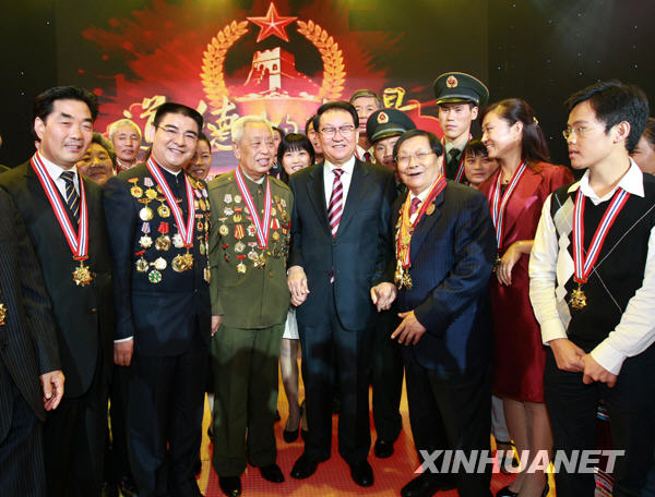 这是典礼结束后,李长春与部分全国道德模范合影留念。