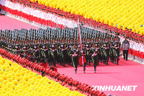 10月1日,首都各界庆祝中华人民共和国成立60周年大会在北京天安门广场举行。这是国旗护卫队护卫国旗走向旗杆基座。