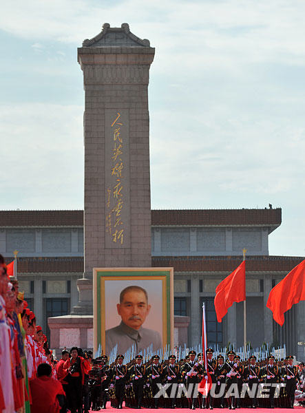 10月1日,首都各界庆祝中华人民共和国成立60周年大会即将在北京天安门广场举行。这是国旗护卫队护卫国旗走向旗杆基座
