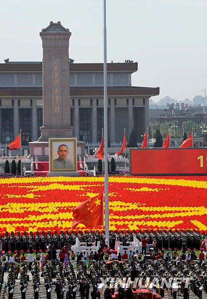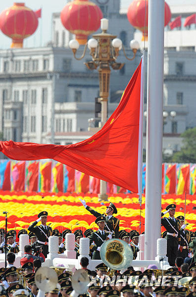 10月1日,首都各界庆祝中华人民共和国成立60周年大会在北京举行。这是天安门广场举行隆重的升国旗仪式。
