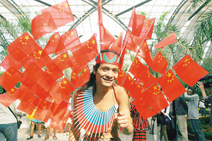 热带植物观光园佤族青年身背60面国旗庆国庆华诞