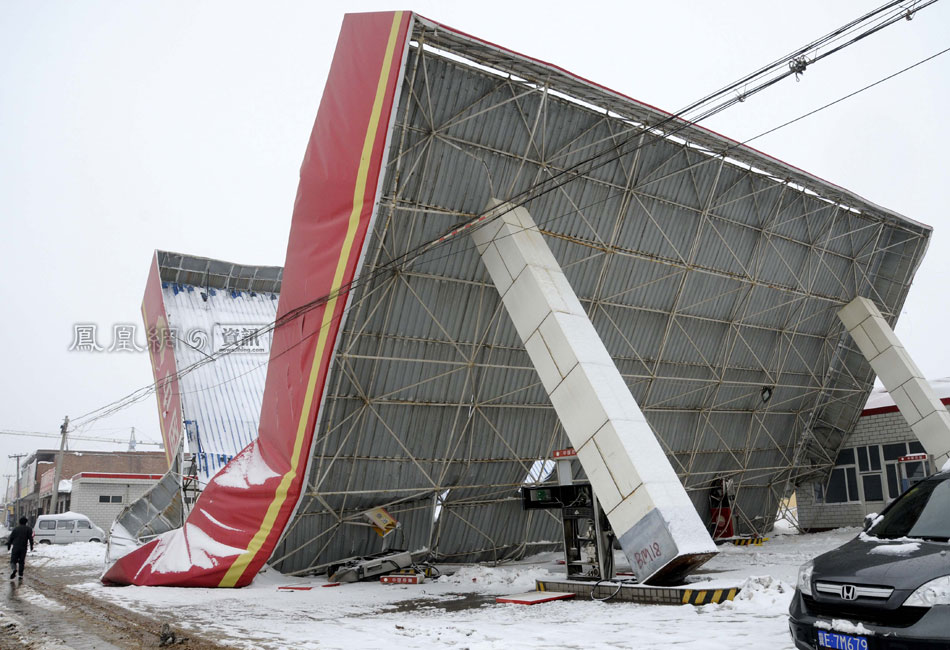 | 2009年11月12日,在河北邢台县南石门镇西小郭村附近,一座大型加油站被暴雪压塌。从11月10日晚开始的暴雪,是邢台55年来降雪之最,市区积雪量36厘米,气象台连续发布暴雪和道路结冰红色预警信号。这次暴雪时段集中、强度大,造成比较严重的积雪,部分地区的交通、运输、电力、农业等造成较大影响。 |