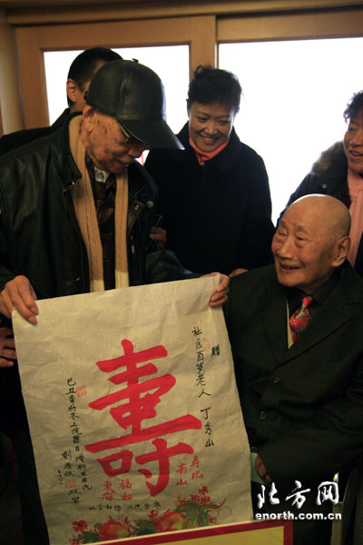 截至目前,本市百岁老人有200余人,全市对百岁老人每人每月发放200元的营养补贴。在丁秀山老人生日即将到来之际,河西区尖山街也送来了补贴和祝福。社区里82岁的志愿者刘思斌老先生也用自己亲自撰写的“寿”字为丁秀山老人贺寿。正像老人期望大家都长命百岁一样,我们也同样祝福丁秀山老人能健康幸福。