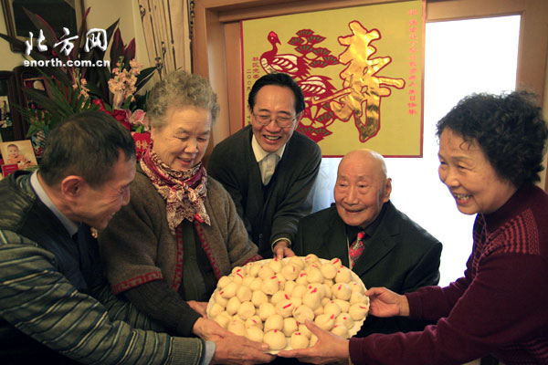 丁秀山老人面色红润,精神矍铄。老人育有五子二女,年龄最大的76岁,最小的也有58岁了。现在全家四世同堂,一共有56口人,家人都戏称他们56口人是56个民族。众多子女儿孙绕膝,丁秀山老人的晚年生活其乐融融。