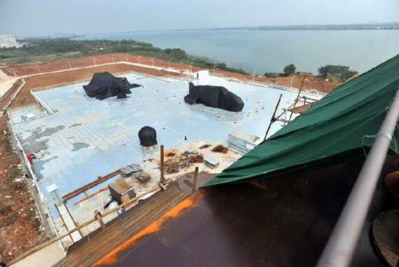 | 资料图:2009年10月14日,武汉,航母式建筑顶部停放着两架被包裹的飞机 |