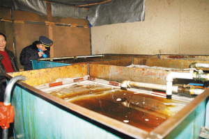根据群众举报,记者跟随天津市河北区质量技术监督局执法人员来到位于天泰路上的这家“天津福盈工贸有限公司”。生产加工区的纸屑遍地。上了二楼,走进主储油罐,只见放在储油罐上的木板积满了尘土。这些木板下存有大量还没有使用的食用油。配油房内,用于储存食用油的金属罐上也满是油污。该公司负责人艾先生介绍,该公司的大型储油罐内共分成了四个储油舱。两个储油舱内存放的是芝麻油,另两个舱内则存放着玉米油。