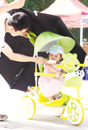 | 2009年6月1日,公园里家长为孩子防暑降温。 |