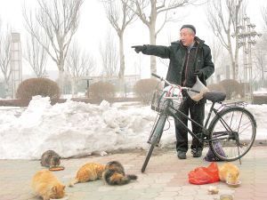 每天早晨骑车十几分钟专程到公园喂养流浪猫,帮这些小家伙在公园里建设栖身之所,悉心照顾生病的猫咪……从2005年开始,家住塘沽民泰里的朱大爷就成了河滨公园几十只流浪猫的“猫王”。在他的带动下,又有数位爱心人士加入到了这一照顾流浪猫的行列中来。