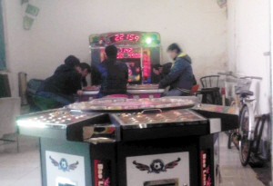 在刘某的带领下,记者在大寺村商业街旁的胡同内找到了这家游戏厅。在游戏厅的门口,还站着几名青年,不时地四处观望。也许是看到刘某并不是生人,几名青年才没有阻拦,记者顺利进到了屋内。只见这间40平方米左右的屋内,摆放有近10台游戏机。墙上写有“概不欠账”的纸条更是十分醒目。也许是因为不是休息时间,所以游戏厅内的人并不多。但在一台大型轮盘赌博游戏机四周,还是坐着三名外地青年。在两台分别名为“超级大亨”和“人猿泰山”的游戏机旁,也有两名青年正在激战。