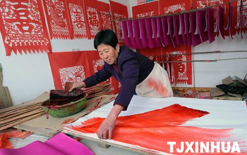 每当春节临近,天津宁河县丰台镇北村农民刘士存纯手工吉祥喜庆刻纸工艺品便成了年货市场上的抢手货。过去,当地家家户户从事刻纸手艺活,如今只有年过花甲的刘士存老人继承了包括刷红纸、制版、雕刻在内的一套祖传刻纸手艺。近几年,刘士存和老伴创作的吉祥喜庆刻纸工艺品成为京津冀和东北、内蒙古等工艺品市场的旺销货,不仅丰富了年货市场,收入还大大超出了务农收入。