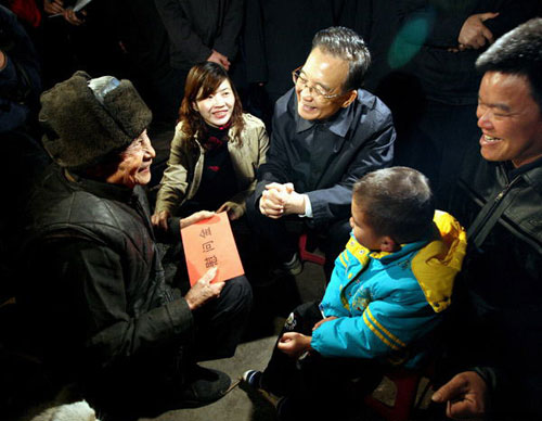 在村民黄辉家,温家宝和他75岁的母亲聊起家常。总理请老人放心,政府一定会让大家有水喝、有水用。他对当地负责人说,春节到了,春耕也快到了,旱情形势不容乐观,抗旱工作不可松懈。要把水利设施建设摆在农村建设的第一位,不仅要保证人畜饮水,还要满足农业生产需要。要大力兴建水库,修建引水工程、雨水集流工程,包括家庭水窖、水柜、水管等,把水送到家家户户,确保群众用上干净、卫生、安全的水,同时也要注意节约用水。
