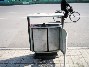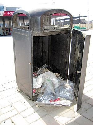 位于河北区中山路中山美食街入口的两个果皮箱成为昨天被“通缉”的第一批“问题”果皮箱。记者在现场看到,美食街中央摆放的两个果皮箱的“大门”已经敞开,里面的内胆露在外面,桶里装的污物清晰可见。