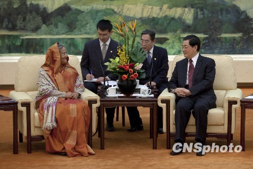 3月19日,中国国家主席胡锦涛在北京人民大会堂会见了孟加拉国总理谢赫·哈西娜。中新社发盛佳鹏摄