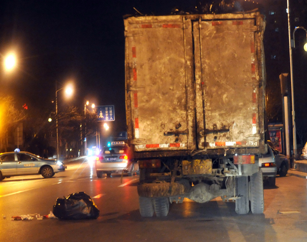 3月5日夜,垃圾小贩把从市区餐饮连锁店收购的垃圾运往郊外,一个垃圾袋不慎从车上掉落。新华社记者刘海峰摄