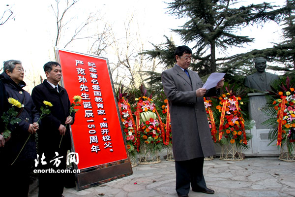 清晨,严范孙先生的亲属代表,南开系列学校的领导、师生代表和南开校友代表等来到南开大学中心花园,在严范孙先生的塑像前敬献鲜花,深深鞠躬,表达南开大家庭对前辈先贤的深切缅怀和无比敬意。随后,严范孙先生诞辰150周年纪念大会在南开大学省身楼举行。江西、广东、福建、上海、南京、天津、贵州、美国纽约等海内外南开校友会以及贵州省史学会向大会发来贺信、贺辞。天津南开校友赵耀民特别献上一副书法贺辞:“久有报国志,创建我南开;允公允能之,日新月异来;桃李满天下,中华栋梁才;饮水应思源,严公汗青载。”