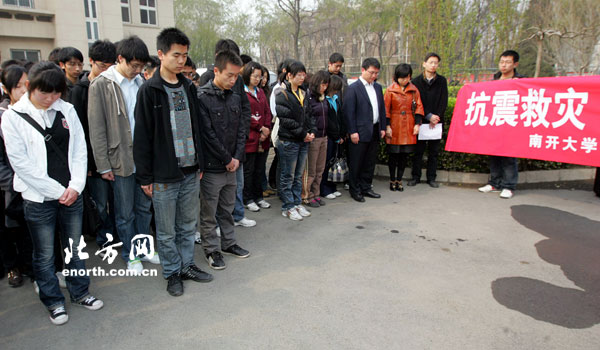 “今天,我们不仅要以鸣钟的方式向地震灾区的遇难者表达哀思,祝愿伤者早日康复,更希望将南开人的爱传递到震区,和玉树人民一起克服难关,迎接美好的明天!”南开大学团委书记张宁宁说。