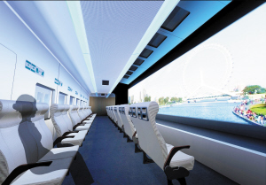 动感影院又称主题演绎厅,是天津厅的重要组成部分。该展厅通过以时速350公里的京津城际高速列车为载体,营造乘车体验,展示天津特色。进入该展厅,仿佛置身一节高铁列车车厢内。而不同于普通的列车车厢的是,这实际上是一个可以同时容纳30人的小型电影院。“‘乘客’入座后,首先通过侧面车窗景物的移动营造出列车启动和高速运行的场景。待‘运行’后,车厢内的坐椅会转动到侧面,届时车厢顶盖掀开,露出长达20米左右的宽银幕,放映一部片长在6分钟左右的具有天津风味的短片。通过故事性的串接,展示天津经济社会发展成就,滨海新区开发开放和天津的发展规划展望。”李培生说。